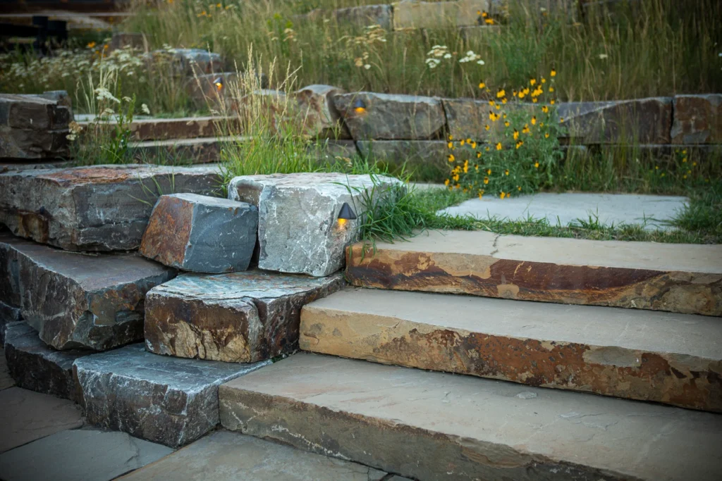 Another way that we use large rocks within a natural landscape design is to add them for stairs. Again, rather than using a manmade paver which has a much more utilitarian look, we’ll use rocks to create traversable stairs.